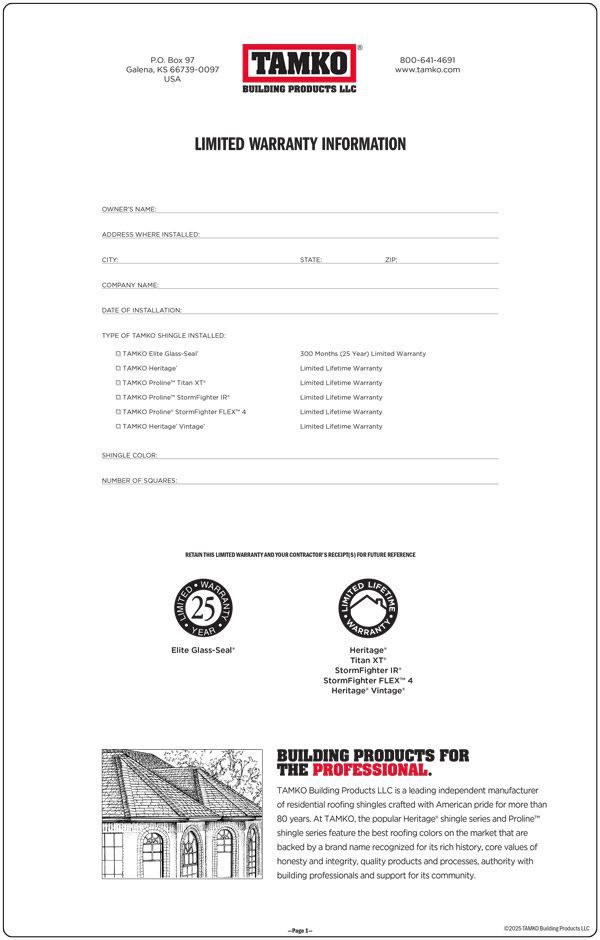 TAMKO TITAN XT AND HERITAGE ROOFING BROCHURES, TITAN XT CASE STUDY, AND WARRANTY